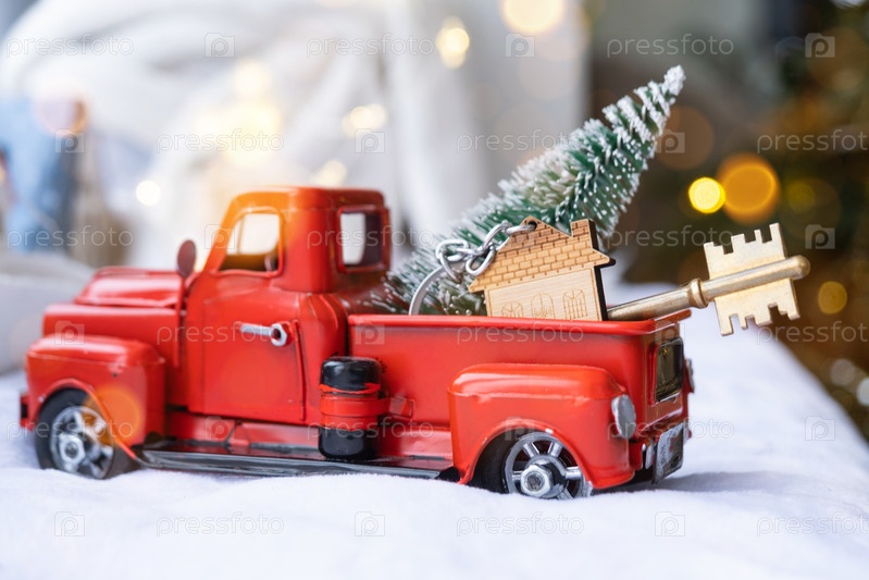 Красный ретро-автомобиль с елкой украшает ключ от дома в пикапе на Рождество. Покупка жилья, переезд, ипотека, кредит, недвижимость, праздничное настроение, Новый год