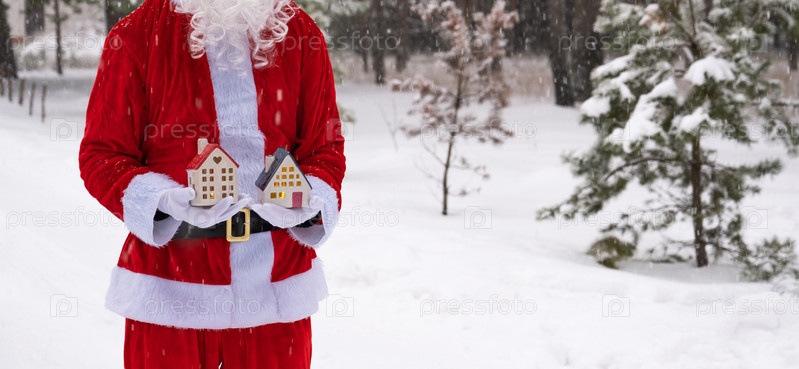Ключ от дома с брелком в руках Санта-Клауса на открытом воздухе в снегу. Сделки с недвижимостью, покупка, строительство, переезд, ипотека. Уютный дом. С Рождеством, новогодним бронированием и залом