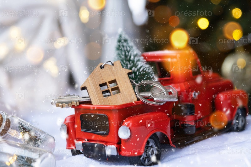 Красный ретро-автомобиль с елкой украшает ключ от дома в пикапе на Рождество. Покупка жилья, переезд, ипотека, кредит, недвижимость, праздничное настроение, Новый год