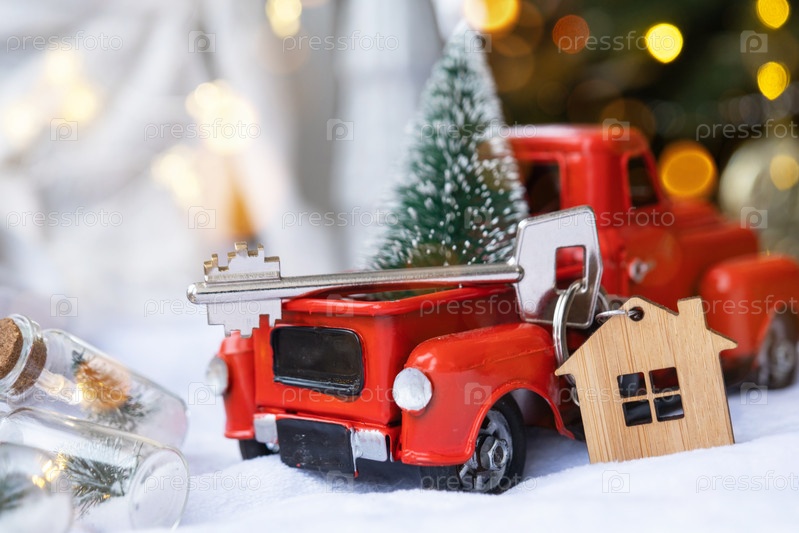 Красный ретро-автомобиль с елкой украшает ключ от дома в пикапе на Рождество. Покупка жилья, переезд, ипотека, кредит, недвижимость, праздничное настроение, Новый год