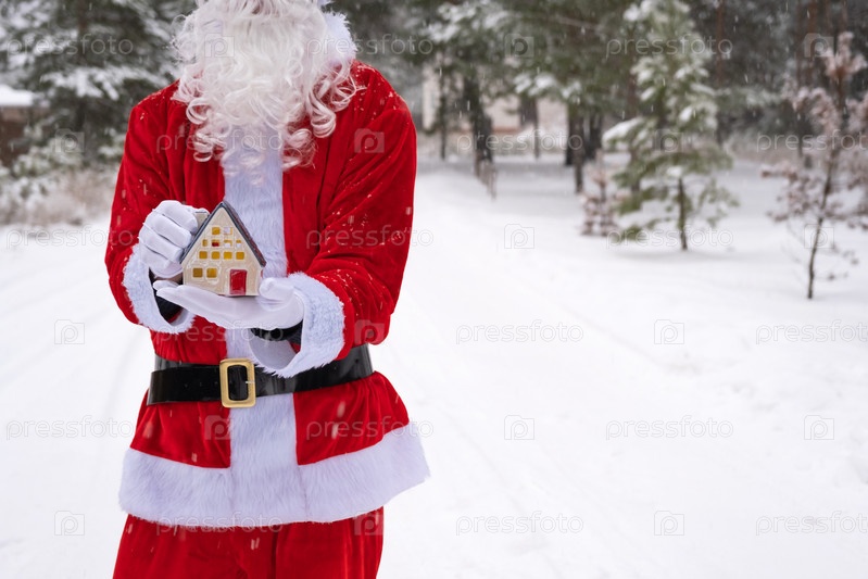 Ключ от дома с брелком в руках Санта-Клауса на открытом воздухе в снегу. Сделки с недвижимостью, покупка, строительство, переезд, ипотека. Уютный дом. С Рождеством, новогодним бронированием и залом