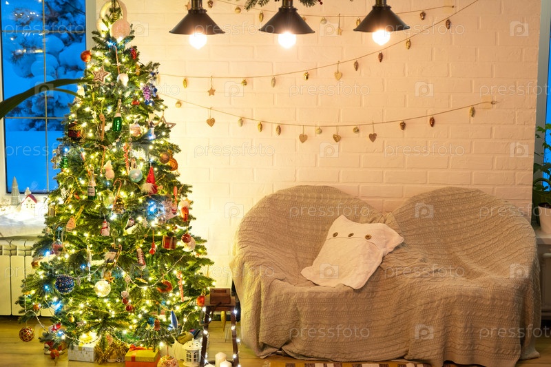 Рождественская елка в белом интерьере дома с кирпичными стенами в стиле лофт с гирляндами из стеклянных игрушек на веревке. Светящиеся волшебные огни украшают комнату-студию. Уютный дом в рождество и новый год