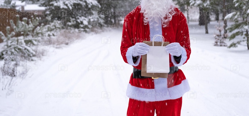 Санта-Клаус на улице зимой и в снегу вручает бумажные пакеты с ремесленным подарком, доставка еды. Шопинг, переработка упаковки, хендмейд, доставка на Рождество и Новый год