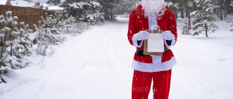 Санта-Клаус на улице зимой и в снегу вручает бумажные пакеты с ремесленным подарком, доставка еды. Шопинг, переработка упаковки, хендмейд, доставка на Рождество и Новый год