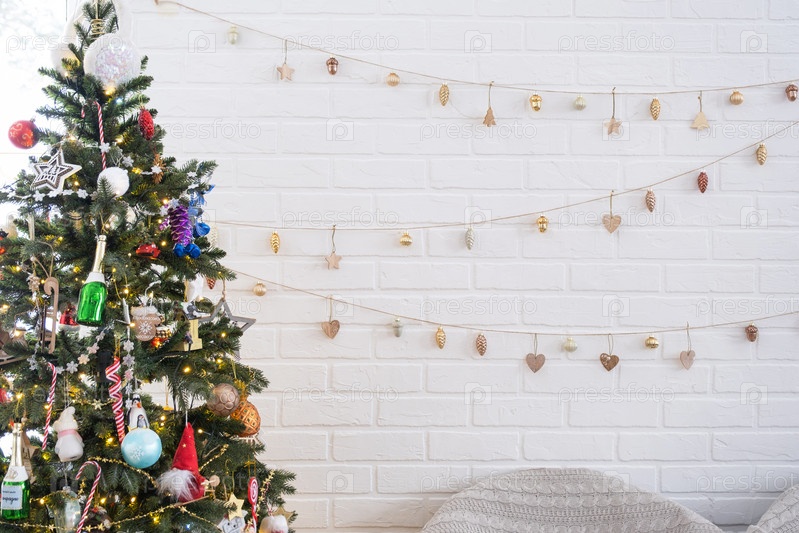 Рождественская елка в белом интерьере дома с кирпичными стенами в стиле лофт с гирляндами из стеклянных игрушек на веревке. Светящиеся волшебные огни украшают комнату-студию. Уютный дом в рождество и новый год