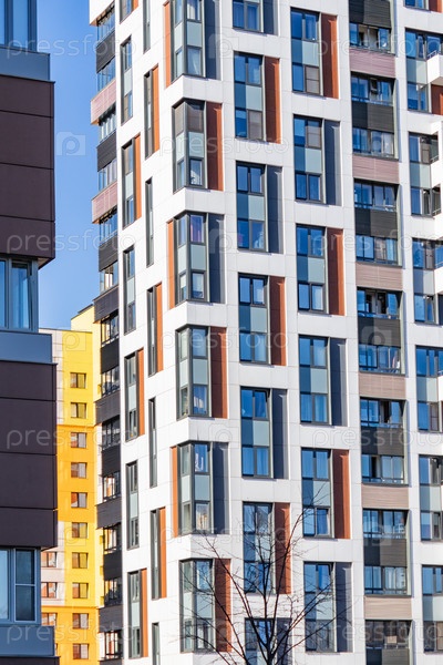 Современный многоквартирный дом с красочными фасадами на окраине города. Жилой комплекс «В лесу», Москва, Россия