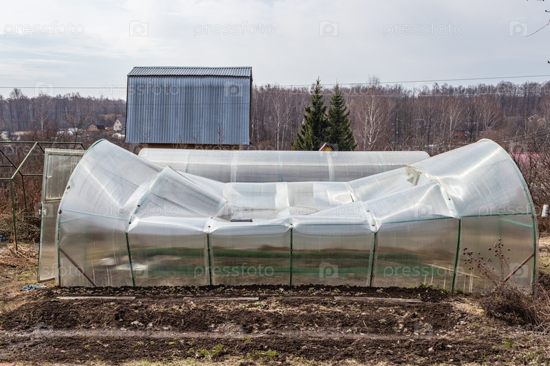 Сломанная теплица в саду. Зимой теплица повреждена снегом и льдом. Тульская область, Россия