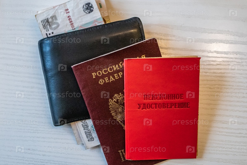 Кошелек, деньги, паспорт и пенсионное удостоверение лежат на столе. Русский перевод: пенсионное удостоверение