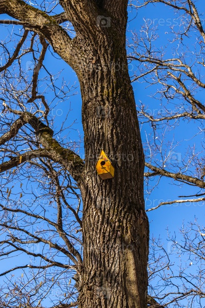 Красивый скворечник в весеннем лесу на высоком дереве на фоне голубого неба. Весенний солнечный день