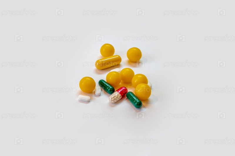 Таблетки и капсулы на белом фоне, красочный ассортимент таблеток фармацевтической медицины