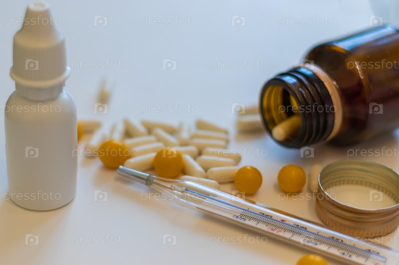 Термометр и таблетки от гриппа и простуды. крупным планом