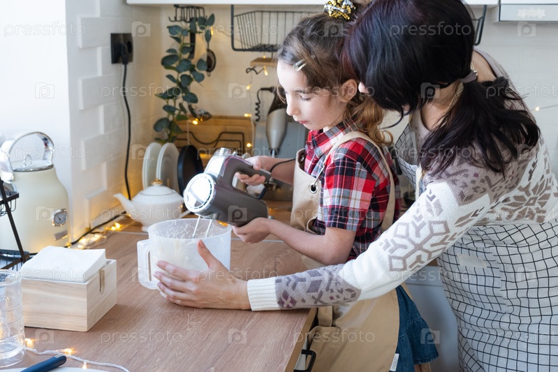Мама и дочка на белой кухне месят тесто в миске для имбирных пряников и печенья блендером на рождество и новый год