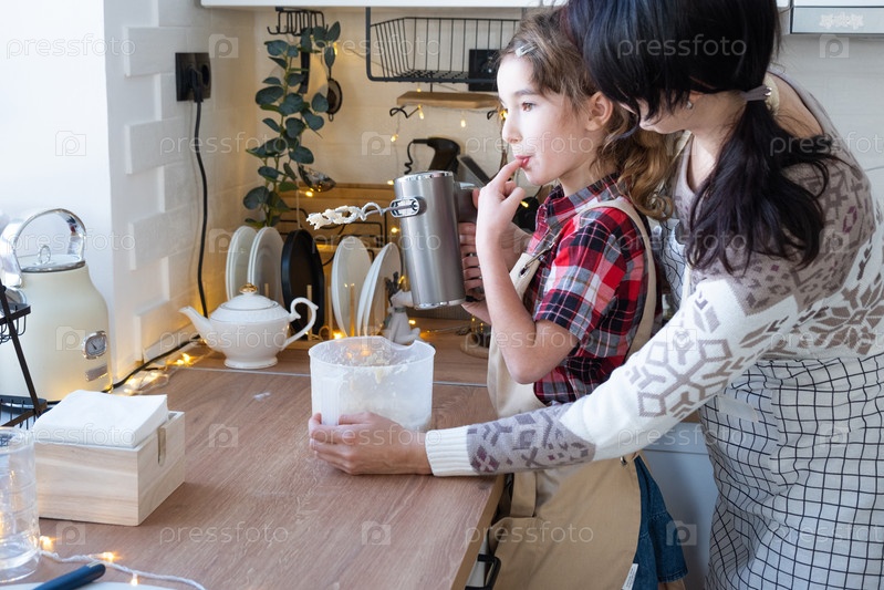 Мама и дочка на белой кухне месят тесто в миске для имбирных пряников и печенья блендером на рождество и новый год