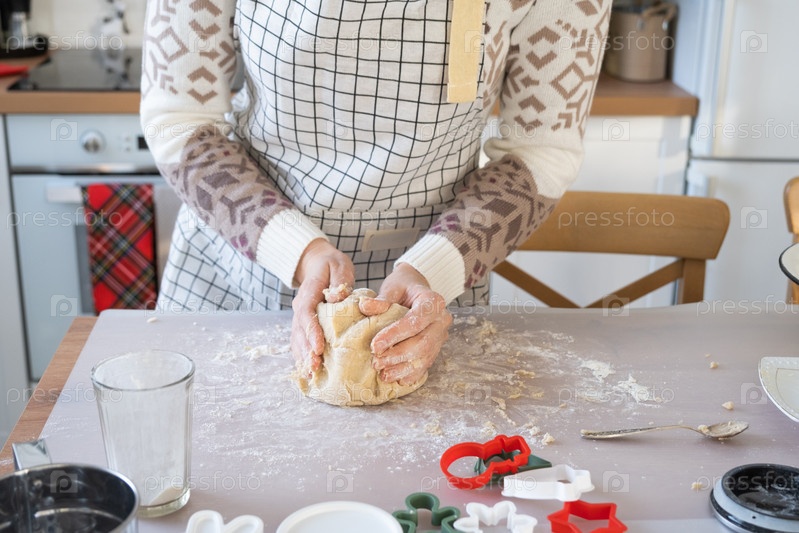Руки месят густое тесто на кухонном столе, украшенном праздничными украшениями на Рождество и Новый год. Выпечка дома, аромат и комфорт. Крупный план
