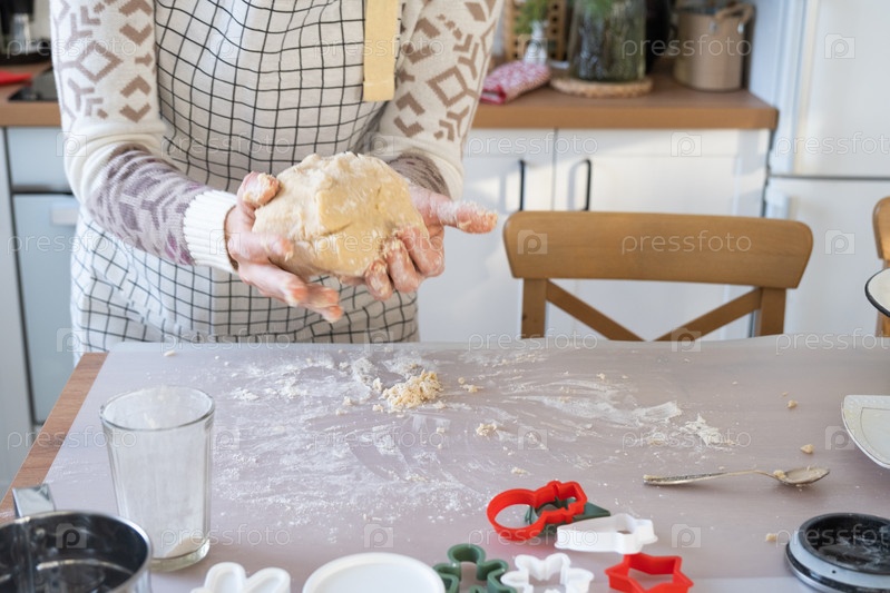 Руки месят густое тесто на кухонном столе, украшенном праздничными украшениями на Рождество и Новый год. Выпечка дома, аромат и комфорт. Крупный план