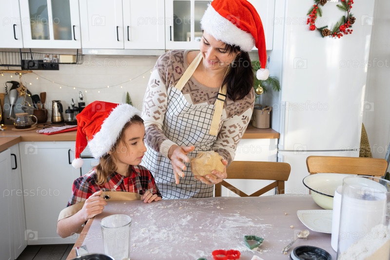Мама и дочь на белой кухне готовят печенье на Рождество и новый год. Семейный день, подготовка к празднику, научиться готовить вкусную выпечку, вырезать фигурки из теста формочками
