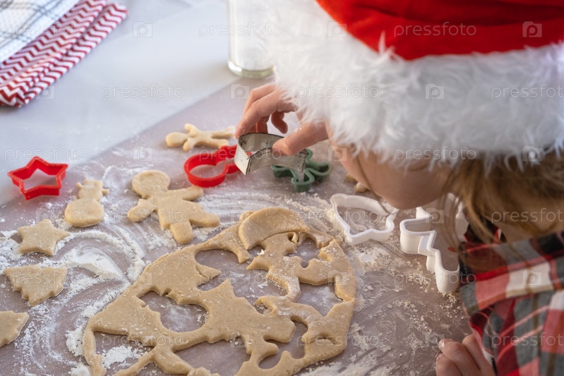 Руки мамы и дочки крупным планом вырезают печенье из теста формочками на новогоднюю тему в виде снеговика, елки, звездочек
