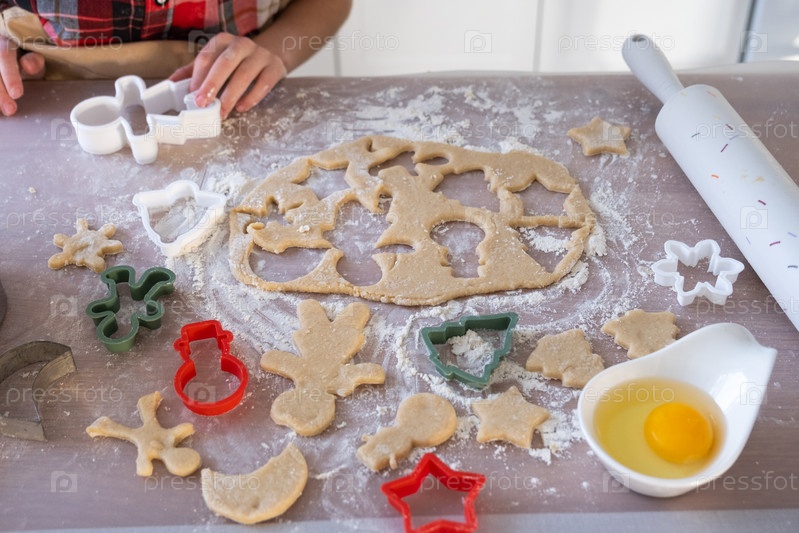 Руки мамы и дочки крупным планом вырезают печенье из теста формочками на новогоднюю тему в виде снеговика, елки, звездочек