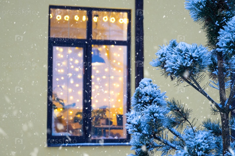 Уютное праздничное окно дома снаружи с теплым светом гирлянд гирлянд внутри - встречайте Рождество и Новый год в теплом доме. Рождественская елка, боке, снег на соснах и снегопад