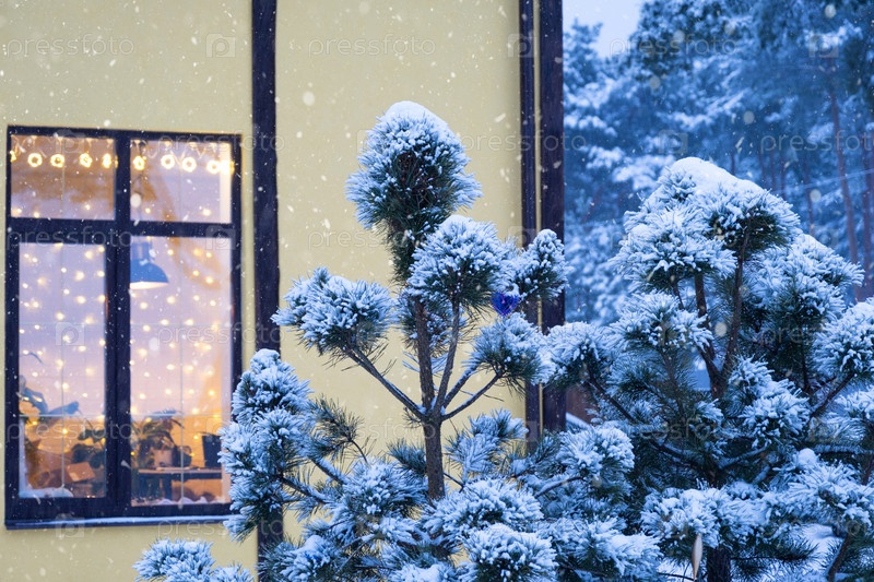 Уютное праздничное окно дома снаружи с теплым светом гирлянд гирлянд внутри - встречайте Рождество и Новый год в теплом доме. Рождественская елка, боке, снег на соснах и снегопад
