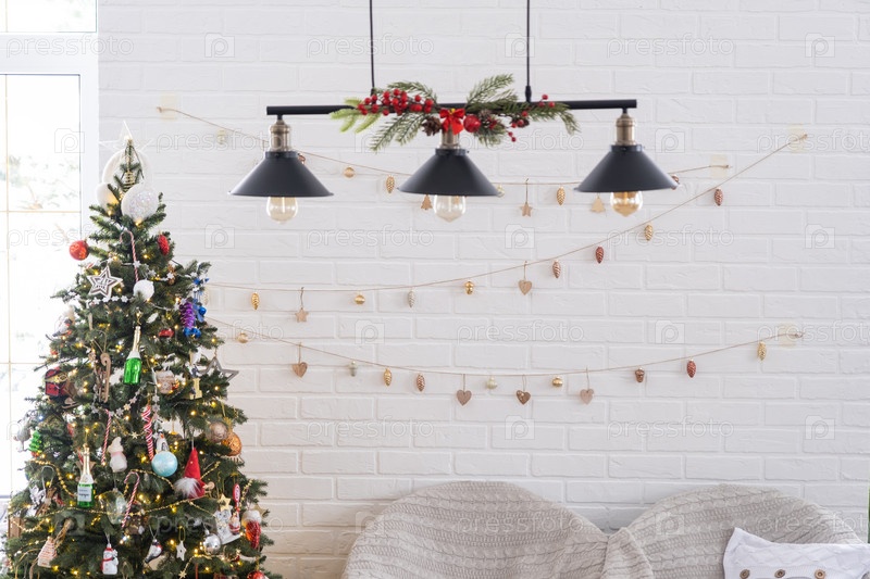 Рождественская елка в белом интерьере дома с кирпичными стенами в стиле лофт с гирляндами из стеклянных игрушек на веревке. Светящиеся волшебные огни украшают комнату-студию. Уютный дом в рождество и новый год