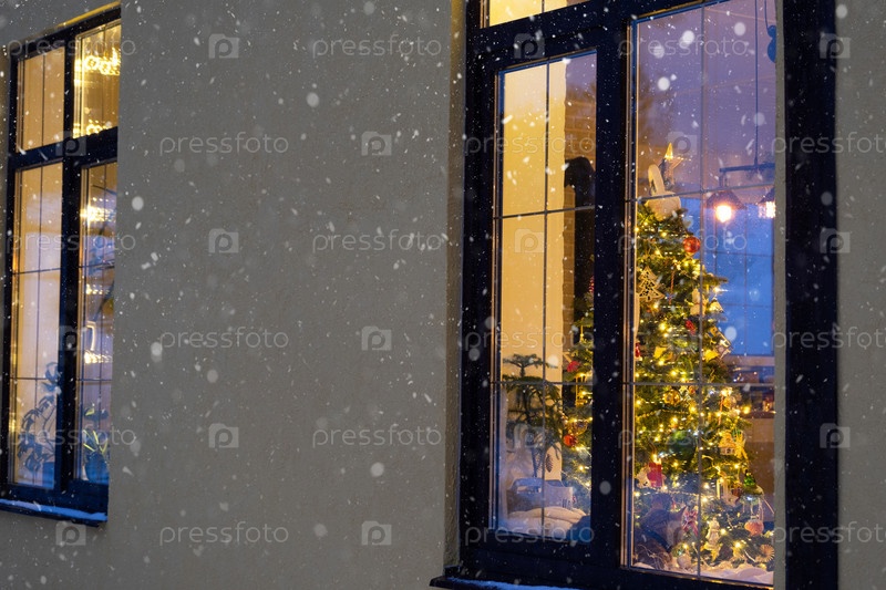 Уютное праздничное окно дома снаружи с теплым светом гирлянд гирлянд внутри - встречайте Рождество и Новый год в теплом доме. Рождественская елка, боке, снег на соснах и снегопад