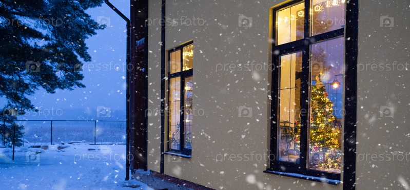 Уютное праздничное окно дома снаружи с теплым светом гирлянд гирлянд внутри - встречайте Рождество и Новый год в теплом доме. Рождественская елка, боке, снег на соснах и снегопад