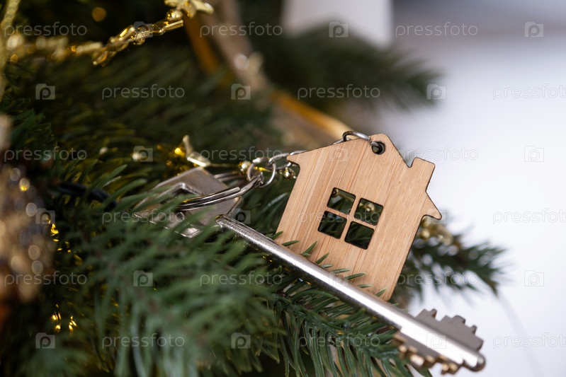 Ключ от дома с брелоком висит на елке. Подарок на Новый год, Рождество. Строительство, дизайн, проект, переезд в новый дом, ипотека, аренда и покупка недвижимости. Копировать пространство