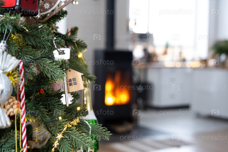 Ключ от дома с брелоком висит на елке. Подарок на Новый год, Рождество. Строительство, дизайн, проект, переезд в новый дом, ипотека, аренда и покупка недвижимости. Копировать пространство