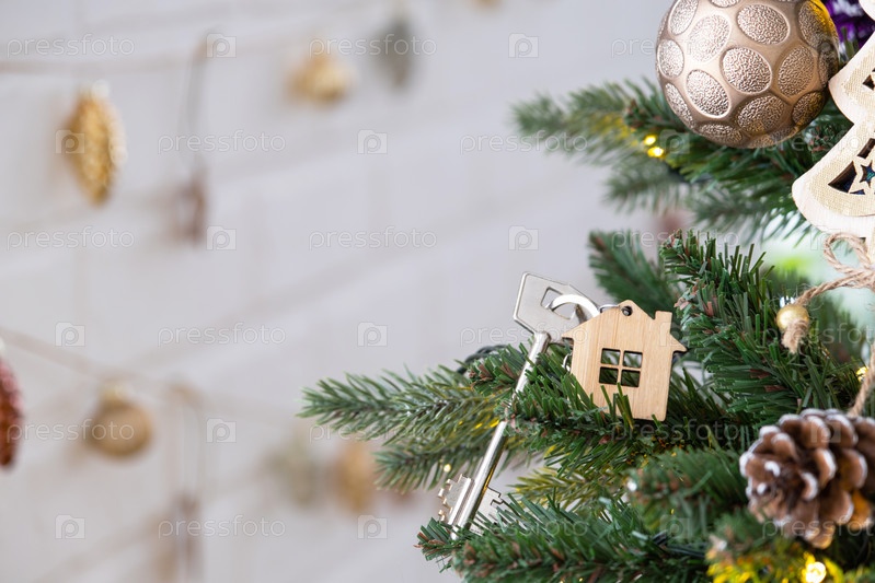 Ключ от дома с брелоком висит на елке. Подарок на Новый год, Рождество. Строительство, дизайн, проект, переезд в новый дом, ипотека, аренда и покупка недвижимости. Копировать пространство
