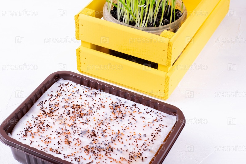 Семена микрозелени посажены на мокрую ткань, а проросший овес в желтой коробке на белом столе. Посадка и выращивание зелени в домашних условиях