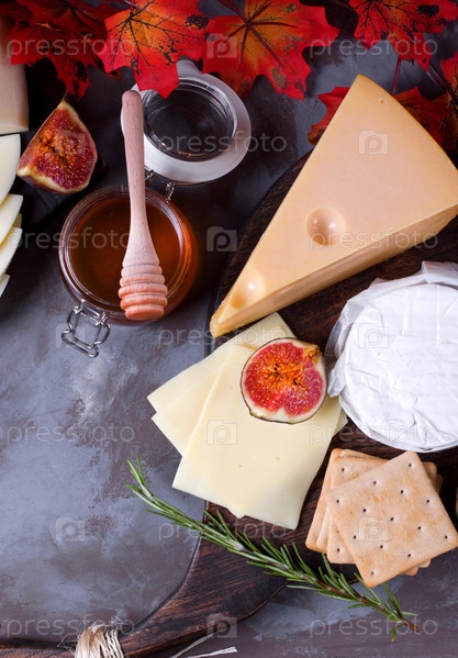 Сырная доска с бри, маасдамом, гаудой и козьим сыром, инжиром, медом и джемом. Ассортимент закусок на сером столе