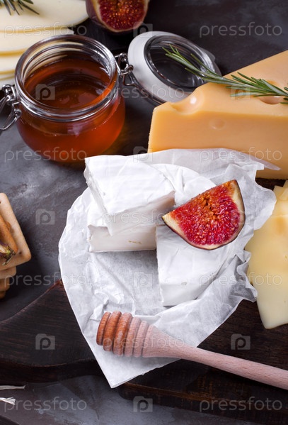 Сыр бри и другие виды сыра, инжир, мед и варенье. Сырная тарелка подается на деревянной доске