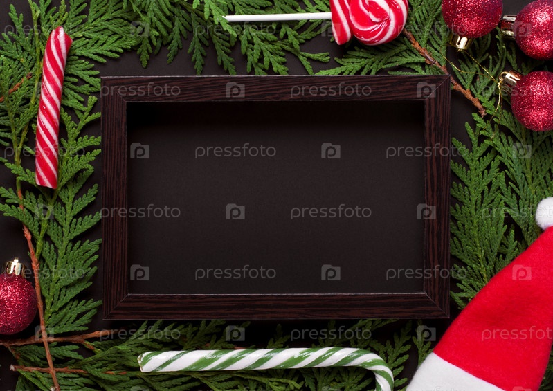 Рождественский фон с темной деревянной рамкой, ветвями туи, красными безделушками, леденцами на палочке и шляпой Санты, создающими пространство для копирования