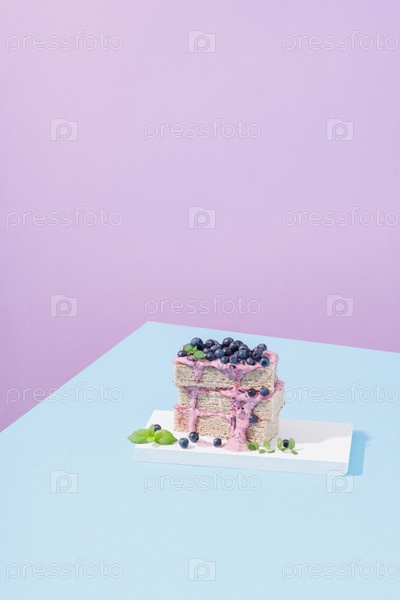 Вафельный торт с черникой и мятой на синем и фиолетовом фоне. Жесткий свет