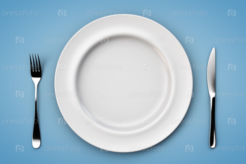 Пустая тарелка на столе. Тема диетологии. Вид сверху