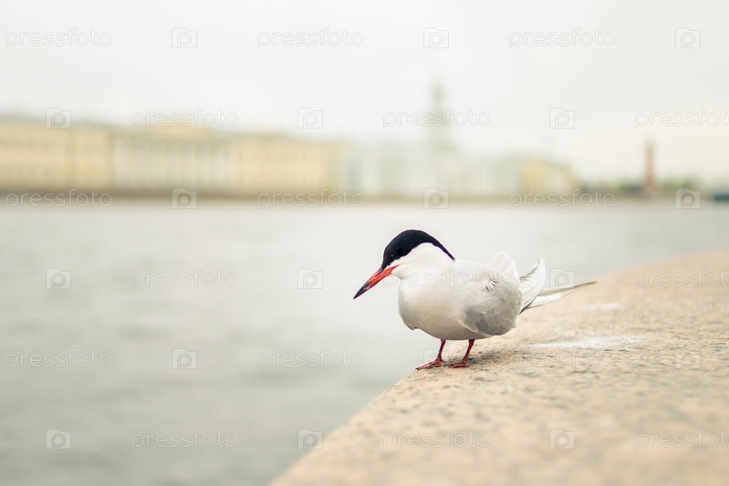 Чайка на берегу реки в городе прекрасный вид на реку и город