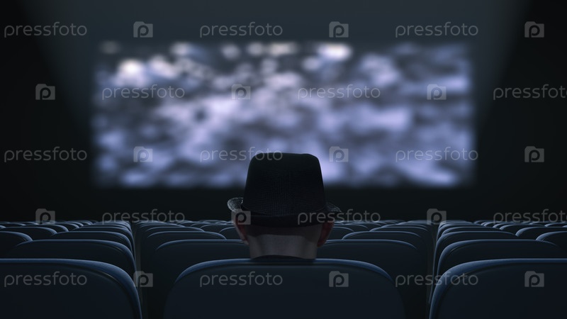 Единственный кинозритель в кинотеатре смотрит фильм. Вид сзади