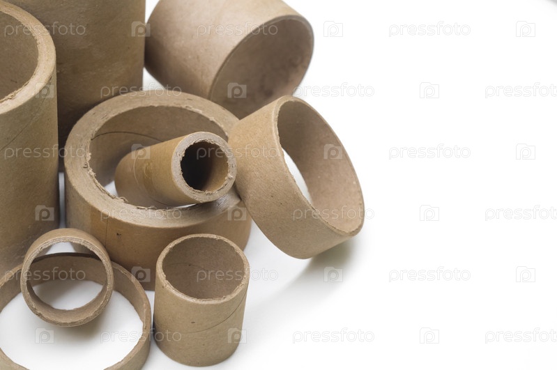 Картонные гильзы разного размера для намотки различных полос материала в типографии. Промышленные бумажные сердечники, трубки и катушки на белом фоне. Выборочный фокус