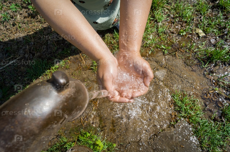 Женские руки под струей воды из городской водной колонки. Выборочный фокус