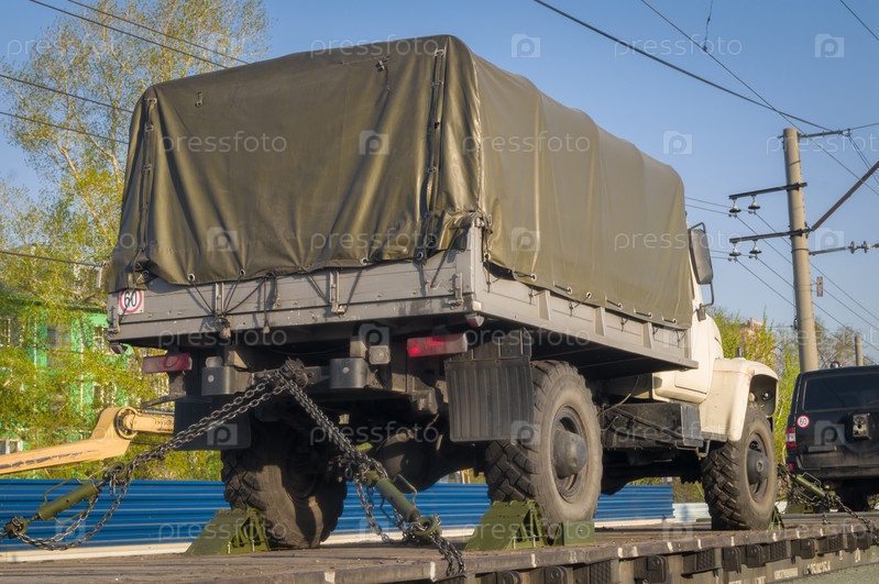 Грузовик с фургоном закреплен на железнодорожной платформе товарного поезда. Перевозка автомобилей и оборудования по железной дороге. Текст на борту платформы - Структурный. Выборочный фокус