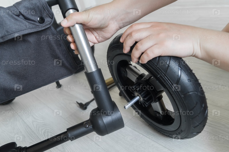 Женщина устанавливает колесо на новую детскую коляску. Процесс сборки коляски для новорожденного. Колесо тележки в сборе. Выборочный фокус