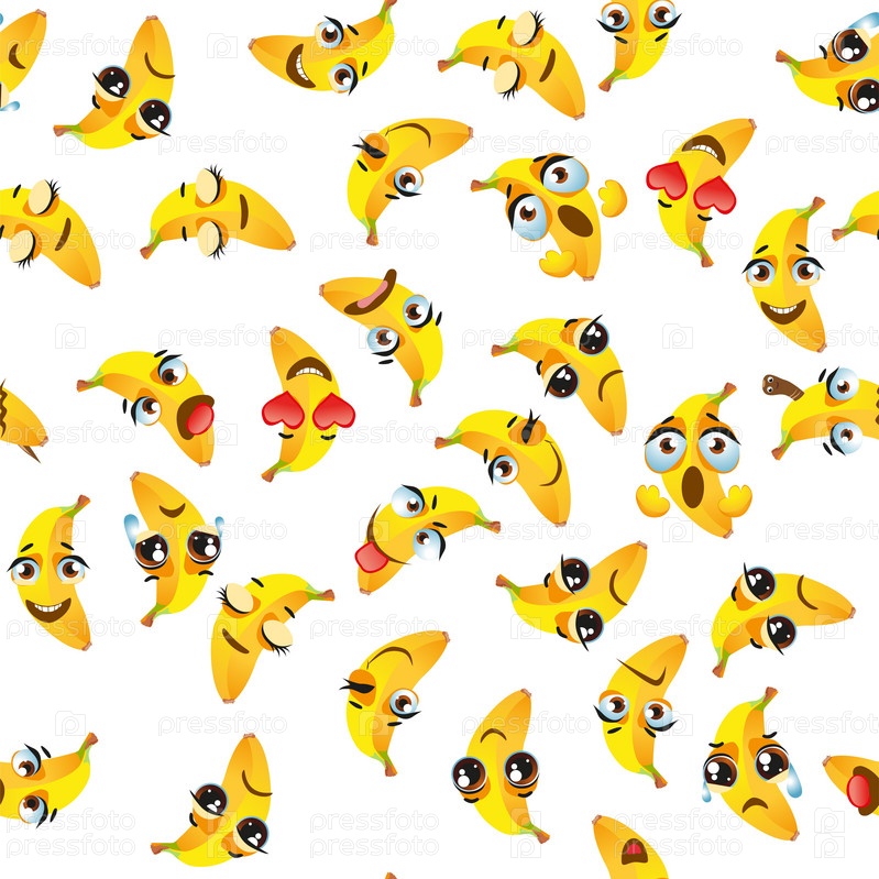 Бесшовный узор из экзотических фруктов банан. Смешные милые лица персонажей