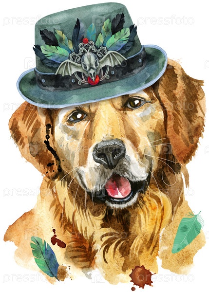 Акварельный портрет золотистого ретривера в оливковой шляпе с вороньим черепом и перьями