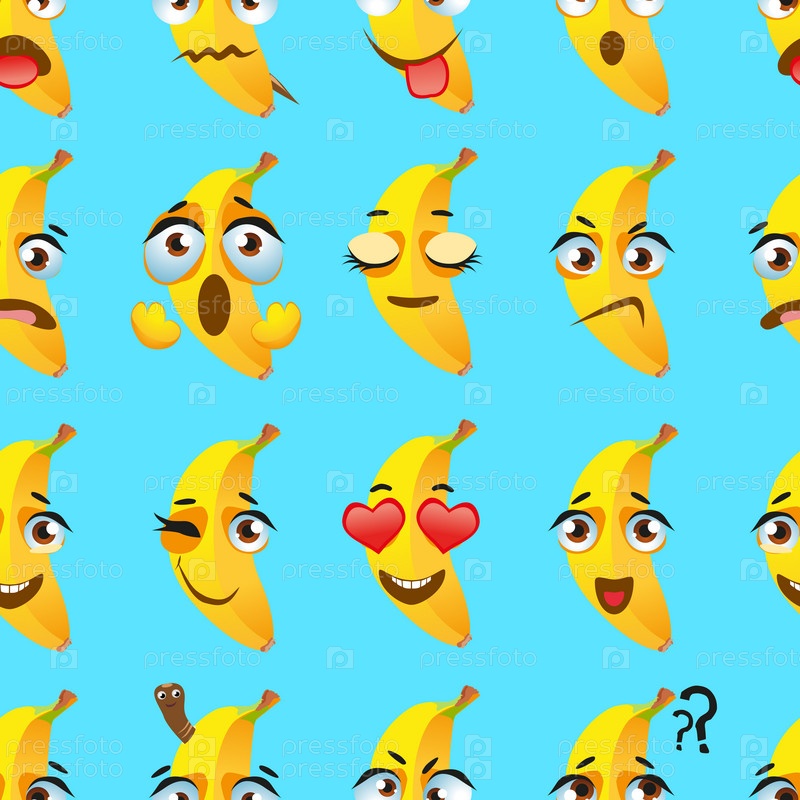 Бесшовный узор из экзотических фруктов банан. Смешные милые лица персонажей