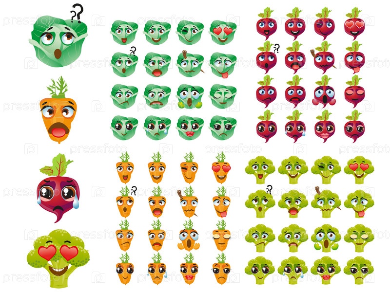 Набор векторных наклеек, смайликов с милой брокколи, капустой, морковью, свеклой