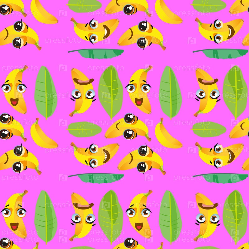 Бесшовный узор из экзотических фруктов банан. Смешные милые лица персонажей