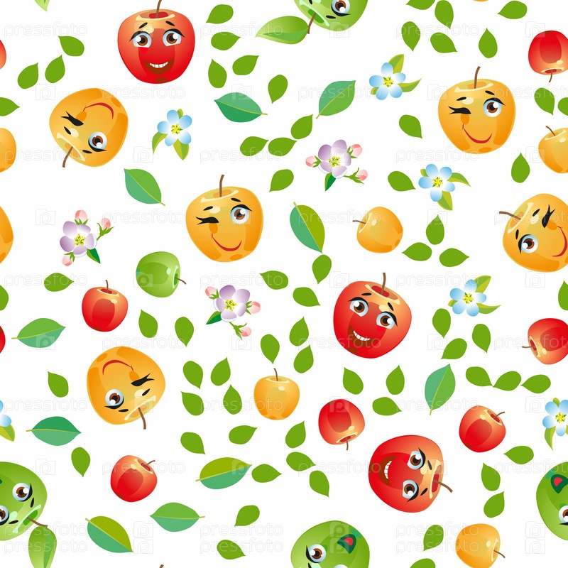 Бесшовный рисунок фруктового яблока. Смешные милые лица персонажей