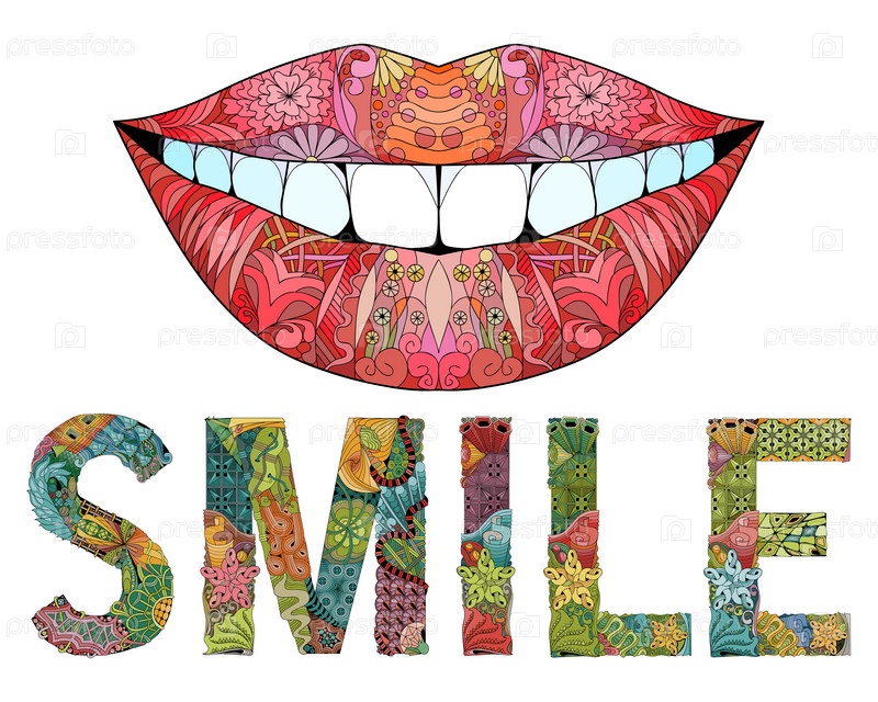 Слово улыбка с силуэтом губ. векторный декоративный объект zentangle