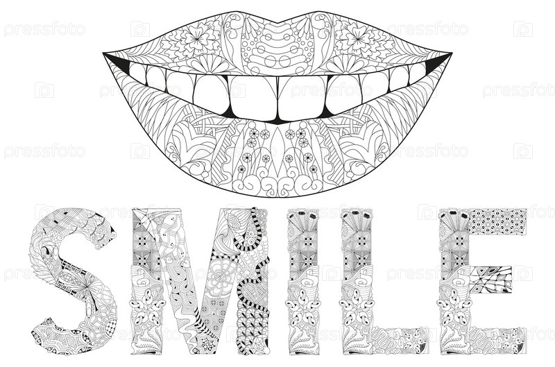 Слово улыбка с силуэтом губ. векторный декоративный объект zentangle